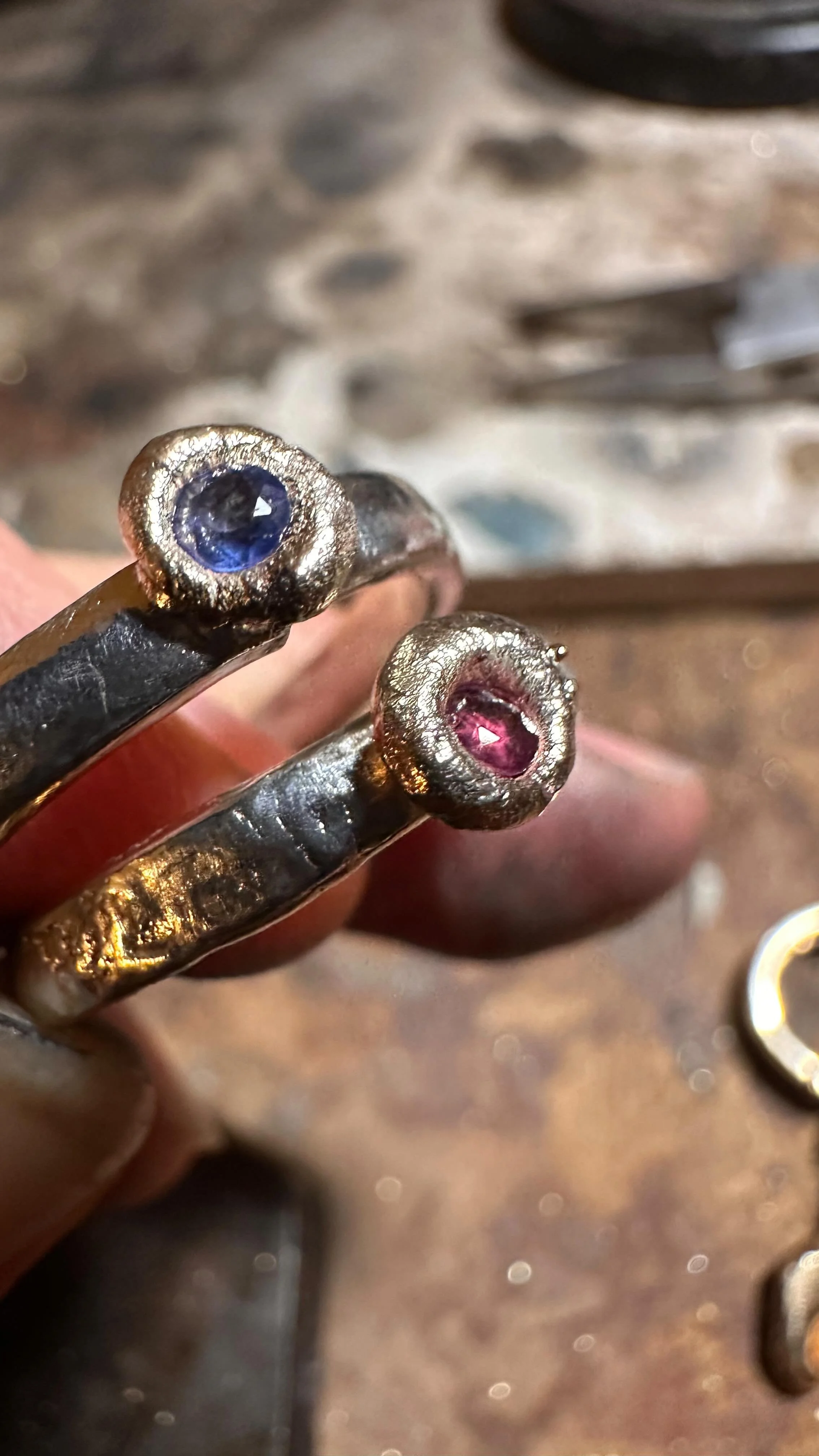 Working exclusively with recycled precious metals and reclaimed gemstones, each piece is slowly hand sculpted in our UK studio — either carved from wax and cast with gemstones embedded, or formed directly from bullion. Texture is at the heart of our aesthetic. Rings, pendants, and earrings evoke the feeling of unearthed rocks, with glimmers of gemstone like puddles of water or shafts of sunlight breaking through.